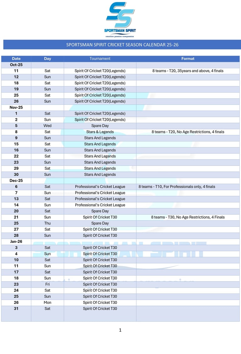 With immense joy we would like to annouce our upcoming cricket calendar for the season 2025-26. This upcoming season will have More thrill and excitement for all our participants and sponsors. More updates will be shared on this page soon. Stay Tuned.
